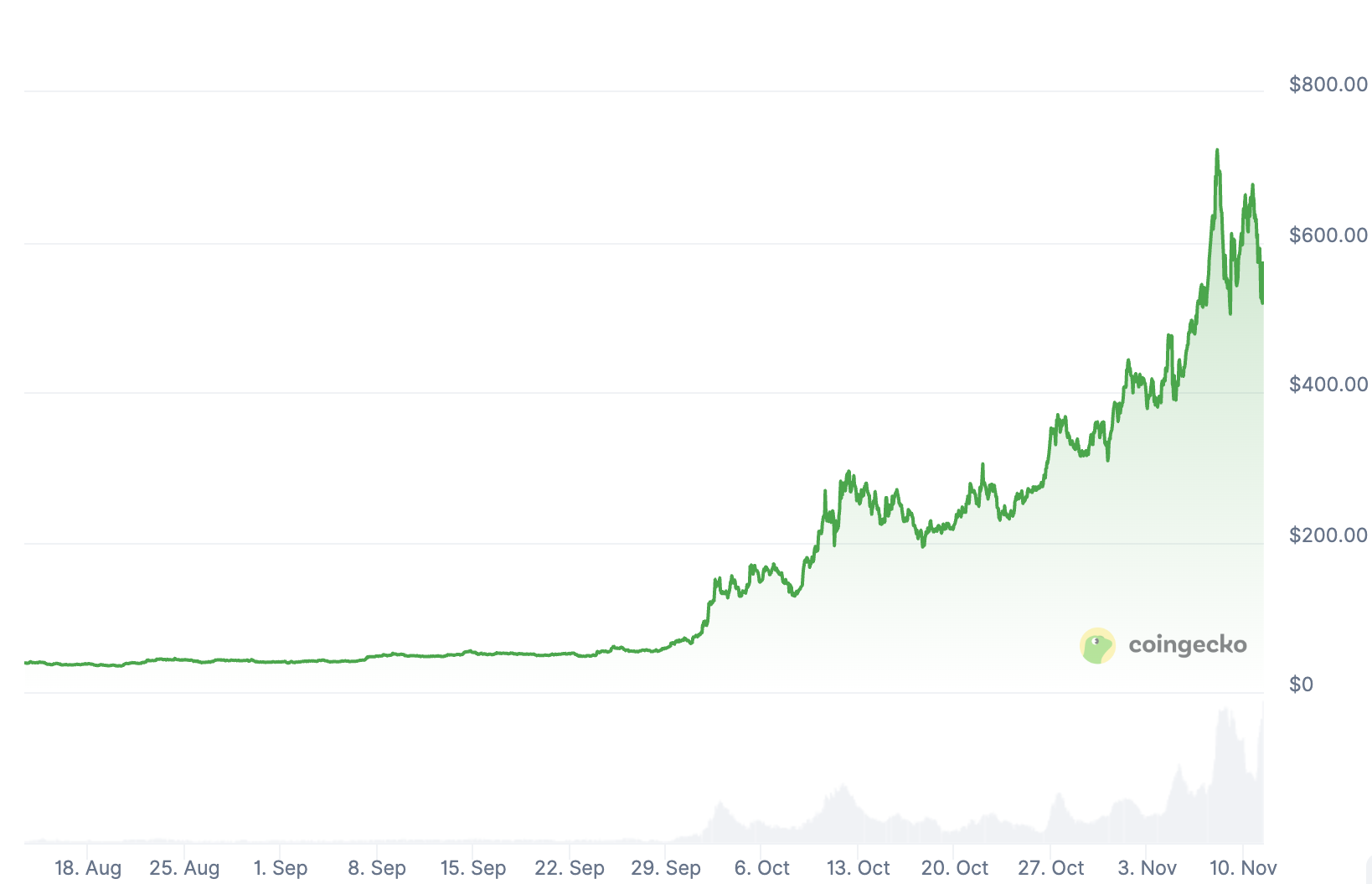 Coingecko: ZEC 价格走势图,展示两个月内从低位飙升超过10倍的惊人曲线